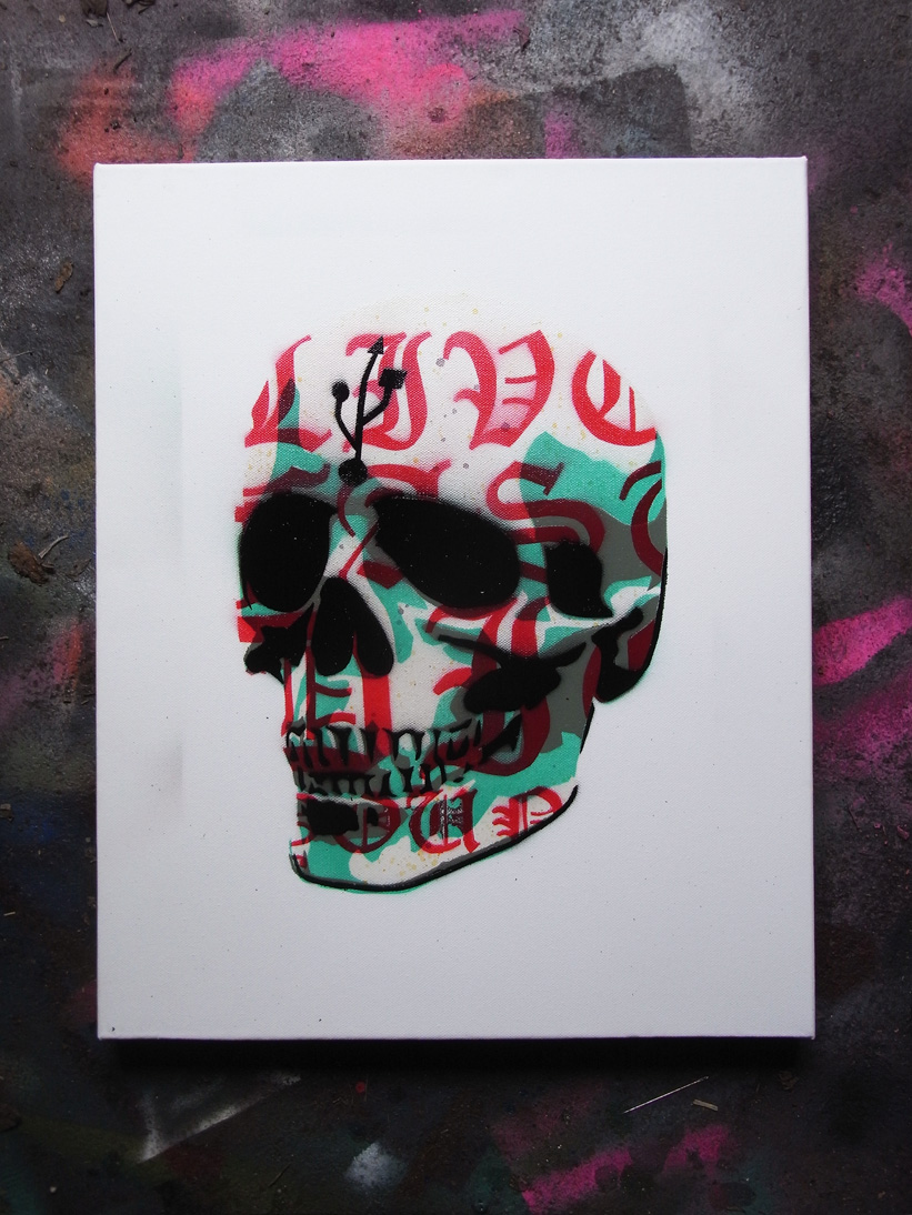 Posted in Artworks, Street Art, tagged art, canvas, human, live fast and die young, old english, skull, spray paint stencils, stencil, stencil graffiti, Street Art, text, usb on June 24, 2010| 1 Comment »