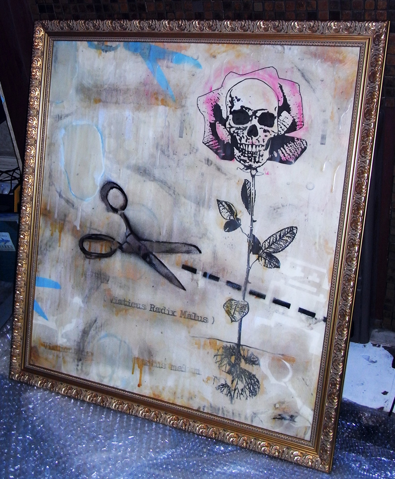 I just got my painting ‘Viaticus Radix Malus’ or in english, ‘Money is the root of all evil’ back from being framed. I think it looks very sexy. I opted away from my usual plain black minimal and modern looking frame for an ornate gilt or gold frame. I think the irony adds to the strength of the message in the image.