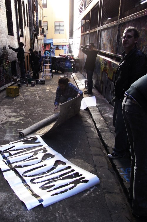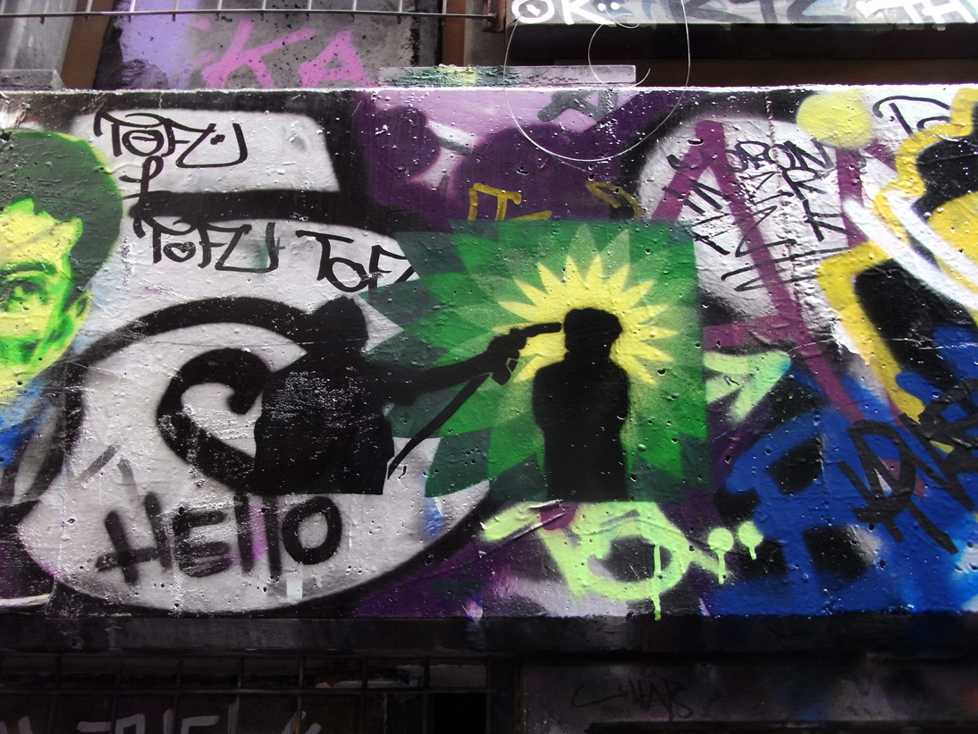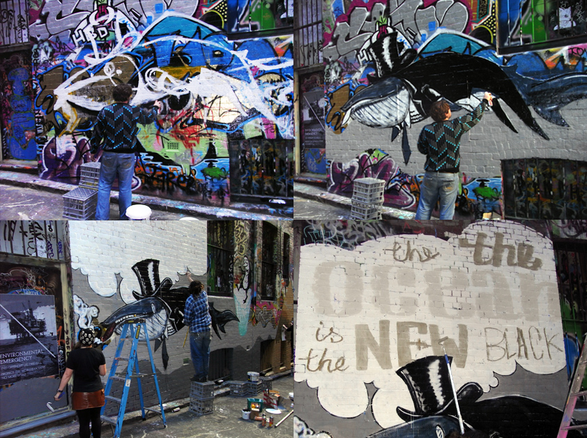 Today about a dozen or so artists hit up the back section of Hosier lane in Melbourne to do a wall in protest of the BP oil spill. There were some of the familiar suspects from the scene including HaHa, Civil and Mags(from brisvegas) among others. It was a pretty cool day with everyone helping each other out and working well together to link in a whole bunch of diverse styles and create a bit of unity surrounding this important issue.