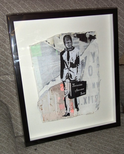 I got my ‘Terrorists often wear suits’ image back from the framers yesterday. It’s the version pasted on the billposters that were taken down from Hosier lane recently. It one of my favs for a while as it looks really precious the way it has been framed, while still remaining very street in my opinion.