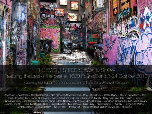 Posted in Exhibition, News, Street Art, tagged 1000 pound bend, exhibition, melbourne, no frills art, Street Art, sweet streets on September 22, 2010| 1 Comment »