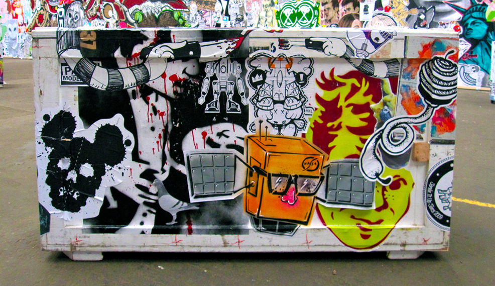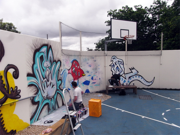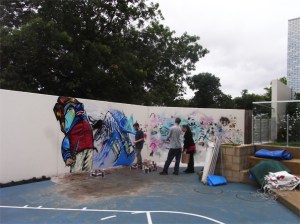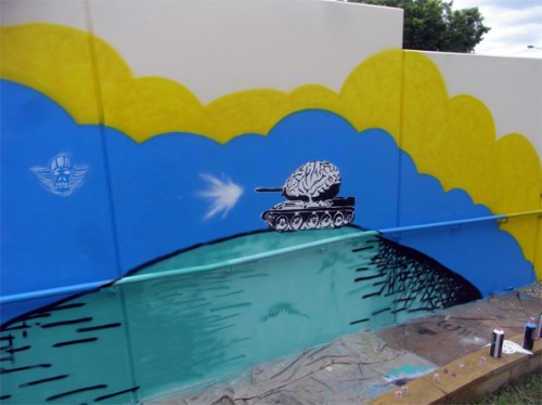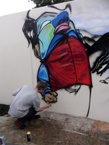So after having a big night in celebration, I had to be awake and up at Boxhill Hospital to give back to the community and do a makeover of their Adolecent Health Unit with a bunch of other melb artists bright and early. Organised by Doil over at the Melbourne Street Tours some of the other artists included the man himself Doil, Adi, Tad Evil, Rusty, Makatron and some of the boys from the Napier Crew. If there was any fear i was going to fall asleep during the day from the big night, that quickly went away due to the complete…and i mean complete soaking that i got on the way to the hospital.