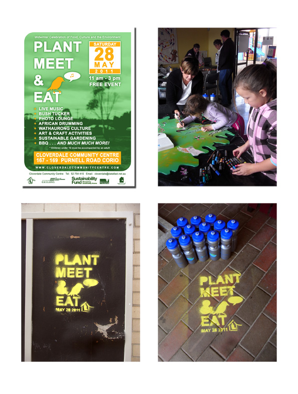 I recently did some graphic design work for the Plant Meet & Eat festival in Cloverdale. Just because you are getting paid to do something a little more commercial doesn’t mean you can’t hang onto your fundamental aesthetics. As a sideline to the design work for the Community Centre, I got them onto a bit of Guerilla Advertising using stencils and temporary line marking spraypaint.